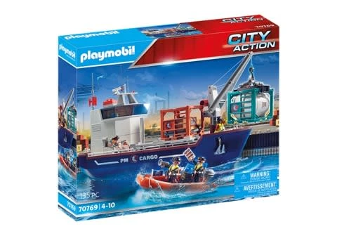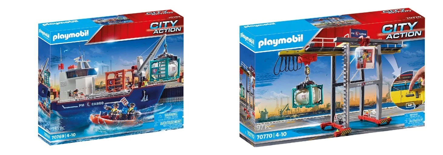 Playmobil 2er Set bestehend aus:PLAYMOBIL® 70769 Großes Containerschiff mit ZollbootPLAYMOBIL® 70770 Portalkran mit ContainernPLAYMOBIL® 70769 Großes Containerschiff mit ZollbootHier treffen jeden Tag Frachten aus verschiedensten Ländern ein. Gerade fährt wieder ein großes Containerschiff ins Hafenbecken ein und wird von der Kapitänin zentimetergenau ans Terminal manövriert. An Bord des Frachtschiffes befinden sich mehrere große Container, die nun mithilfe des beweglichen Verladekrans mühelos ausgeladen werden. Um den knappen Zeitplan einzuhalten, muss jedes Detail passen, doch die Kapitänin und ihre Crew sind echte Profis. Natürlich werden alle Waren beim Zoll ordnungsgemäß angegeben. Die Beamten stehen bereits in ihrem Zollboot bereit. Toller Spielspaß für alle Nachwuchs-Logistiker. Das Spielset enthält vier PLAYMOBIL-Figuren, ein Containerschiff mit Verladekran, ein Zollboot mit Außenbordmotor, Container, Fernglas, Megaphon und viele weitere raffinierte Extras. Das Frachtschiff schwimmt und kann mit einem Unterwassermotor (7350) aufgerüstet werden. Verladekran (360° drehbar) zum einfachen Be- und Entladen des Schiffes. Inkl. Laderaum und 2 neuen Containern. Das Schiff (aufrüstbar mit Unterwassermotor) schwimmt und bietet viel Ladefläche für die neuen Container. Maße: 50 x 19,5-20,5cm (seitl. Aufleger) x 25-33,5cm (LxTxH) (variable Kranhöhe, ohne Antennen). Das Zollboot (aufrüstbar mit Unterwassermotor) schwimmt, der Außenbordmotor ist schwenkbar. Maße: 20 x 10,5 x 7,5cm (LxTxH). Dieses Set enthält 3 Männer, 1 Frau, 1 Containerschiff, 2 Container, 1 Palette mit Fracht, 1 Zollboot, 2 Aufleger, 2 Rettungsringe, 1 Antenne, 1 Hängeleiter, 1 Hakenstange, 2 Pistolen, 1 Megafon, 2 Ferngläser, 1 Feuerlöscher, 1 Hinweistafel, 2 Bücher, 1 Fahne. PLAYMOBIL® 70770 Portalkran mit ContainernIm Minutentakt treffen neue Containerschiffe ein, die zügig be- und entladen werden müssen. Doch dank des elektrischen Portalkrans lässt sich der straffe Zeitplan gut einhalten. Konzentriert sitzt der Kranführer in schwindelerregender Höhe in seiner Krankabine und hebt selbst die schwersten Container mühelos auf das wartende Schiff. Ist alles erledigt, kann die Reise weitergehen. Das Spielset enthält eine PLAYMOBIL-Figur, einen elektrischen Portalkran, einen Stahlrahmencontainer mit Fass, eine Schutzweste und viele weitere Extras. Auf Rädern kann der Portalkran in Längsrichtung verschoben werden und so mehrere Container hintereinander verladen. Zum schnellen Be- und Entladen von LKW oder Containerschiff. Mit Hilfe des eingebauten Motors (benötigt 3 x 1,5-V-Micro-Batterien) können Container angehoben und von einer Seite zur anderen transportiert werden. Maße: 60 x 17 x 54cm (LxTxH). Dieses Set enthält 1 Mann, 1 Portalkran, 1 Container, 1 Schraubenschlüssel, 1 Funkgerät.