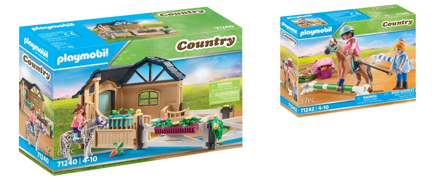 Playmobil 2er Set bestehend aus:PLAYMOBIL® 71240 ReitstallerweiterungPLAYMOBIL® 71242 ReitunterrichtPLAYMOBIL® 71240 ReitstallerweiterungFiguren: 1 Mädchen Tiere: 1 Pferd Zubehör: 1 Reitstallerweiterung, 1 Futterraufe, 1 Stroheinlage, 1 Tränke, 1 Blumenkasten, 3 Grünpflanzen, 1 Rankpflanze, 1 Zügel, 1 Halfter, 3 Karotten PLAYMOBIL® 71242 ReitunterrichtFiguren: 1 Reiterin, 1 Reitlehrerin Tiere: Pferd Zubehör: 3 Cavaletti, 1 Zaun, 1 Blumenwiese, 1 Pferdedecke, 1 Sattel, 1 Halfter, 1 Zügel, 1 Rechen, 1 Schaufel, 1 Pferdeäpfel, 1 Aufbewahrungsbox, 1 Striegelkammset, 1 Reiterhelm, 1 Peitsche, 1 Ranke, 4 Bandagen