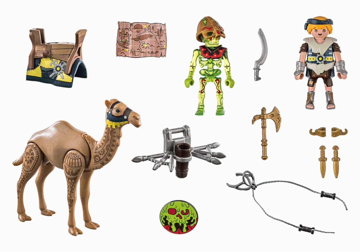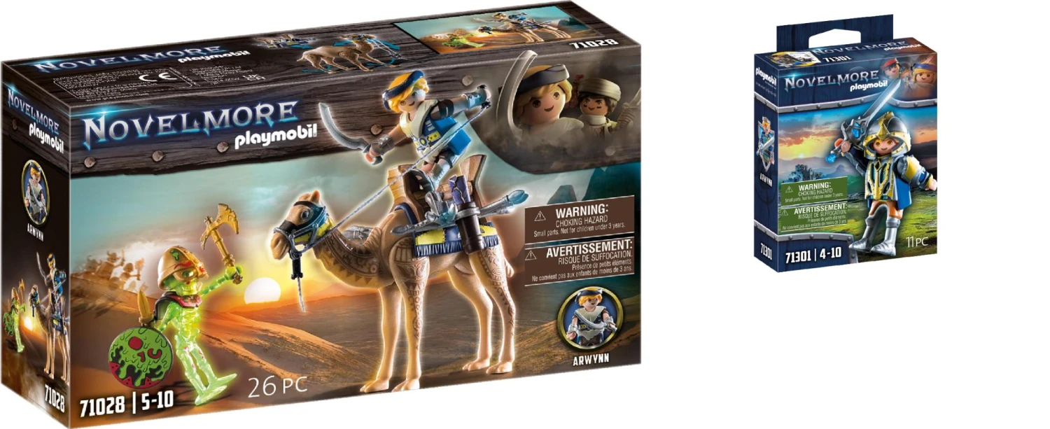Playmobil 2er Set bestehend aus:PLAYMOBIL® 71028 Sal’ahari Sands Arwynn’s MissionPLAYMOBIL® 71301 Novelmore – Arwynn mit InvincibusPLAYMOBIL® 71028 Sal’ahari Sands Arwynn’s MissionHoch oben auf seinem Kamel und ausgerüstet mit einer Karte macht sich Arwynn auf die Suche nach dem Tempel der Skelettarmee. Auf seiner Reise trifft er auf ein bewaffnetes Skelett, das sich seinen Plänen in den Weg stellt. Wie wird die Konfrontation ausgehen? Mit spannenden Figuren, vielseitigen Funktionen und jeder Menge Details laden die Sal’ahari Sands Spielsets von PLAYMOBIL zu aufregenden Wüstenabenteuern ein. Die Satteltaschen des Kamels bieten Platz für verschiedene Utensilien. Figuren: 1x Skelett, 1x Arwynn Tier: 1x Kamel Zubehör: 1 Sattel, 1 Satteldecke, 2 Köcher, 2 Halter für Köcher mit Spitzen, 1 Zaumzeug, 1 Schnurr, 2 Griffe, 1 Schild, 1 Axt, 1 Helm, 2 Dolche, 2 Halter für Dolche, 2 Armmanschetten, 1 Säbel, 1 Kopftuch, 1 Etikettenbogen, 1 Papierkarte PLAYMOBIL® 71301 Novelmore – Arwynn mit InvincibusFiguren: 1 Ritter Zubehör: 1 Krone, 1 Umhang, 1 Köcher, 2 Armrüstungen, 1 Brustpanzer, 1 Helm, 2 Armmanschetten. Prinz Arwynn ist immer bereit für das nächste Abenteuer. Egal ob es gegen die feurigen Burnham Raiders oder in die Wüste von Sal’ahari Sands geht, Arwynn stellt sich jeder Herausforderung mit Mut und Entschlossenheit und mit seinen Freunden Gwynn und Dario. Neben Schwert und Umhang steht Arwynn die magische Rüstung Invincibus zur Verfügung. Legt er diese an, wird er unbesiegbar und schlägt jeden Feind mit Leichtigkeit in die Flucht. Ein perfektes Mitbringsel oder Geschenk für Ritterfans ab 4 Jahren. Produktdetails: Das 11-teilige Ritter-Spielzeug enthält Novelmore Charakter Prinz Arwynn mit Krone, Umhang, Köcher, Helm, Brustpanzer und weiteren Extras für aufregende Ritterabenteuer. Armmanschetten, Umhang und Waffenhalter können abgenommen und gegen Helm und Harnisch der Invincibus Rüstung ausgetauscht werden. Ebenfalls im Set enthalten sind tolle Sticker und eine Arwynn Sammelkarte. Noch mehr Ritterspielspaß gibt es in Kombination mit den weiteren Sets der fantastischen Novelmore-Spielwelt.