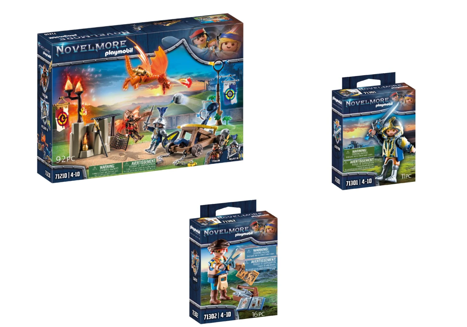 Playmobil 3er Set bestehend aus:PLAYMOBIL® Novelmore vs. Burnham Raiders – TurnierplatzPLAYMOBIL® 71301 Novelmore – Arwynn mit InvincibusPLAYMOBIL® 71302 Novelmore – Dario mit WerkzeugPLAYMOBIL® Novelmore vs. Burnham Raiders – TurnierplatzFiguren: 2 Ritter, Tiere: 1 Drache. Zubehör: 1 Bodenplatte, 1 Kanone mit Halter, 2 Feuergeschosse, 2 Felsen, 4 Holstämme, 2 Äste, 4 Feuerhalter, 2 Flammenkugenl, 2 kleine Flammen, 2 Holzbretter, 1 Flamme, 2 Textil-Fahnen mit Halter, 2 Zielringe mit Fahnen, 2 Pflanzen steckbar, 3 Katapult- Kugeln, 1 Katapult, 2 Ketten mit Griff, 2 Helme, 4 Armrüstungen, 1 Trompete, 1 Schild, 1 Schwert, 1 Speer, 1 Netz, 2 Flügel für Figur. Willkommen beim großen Novelmore-Ritterturnier! Hier treffen die mutigsten Ritter aufeinander und messen in verschiedenen Disziplinen ihr Können. Auch der unerschrockene General McGriffin und Tyragon, der Drachentrainer der Burnham Raiders, stellen sich auf dem Turnierplatz dem Duell. General McGriffin belädt die Schleuder mit Steinen und zielt auf den wilden Feuerdrachen. Doch der Drache ist schneller, hebt ab und so fliegen die Steine ins Leere. Derweil versucht Tyragon so viele Feuergeschosse wie möglich durch die Ringe auf der Novelmore-Seite zu schießen und möglichst viele Punkte zu sammeln. Es bleibt spannend, wer bei diesem Wettstreit als Sieger hervorgeht. Ein actiongeladenes Spielset mit beweglichem Drachen, funktionsfähigem Katapult und spannenden Charakteren liefert viele Ideen für aufregende Ritterabenteuer. Ein großartiges Geschenk für alle Ritterfans ab 4 Jahren. Produktdetails: 92-teiliges Ritterset mit zwei PLAYMOBIL-Figuren, beweglichem Spielzeugdrachen, Bodenplatte, Kanone mit Halter, Katapult und weiterem Zubehör Flexibler Feuerdrache: Alle Gliedmaßen (Kopf, Unterkiefer, Beine, Flügel) des Drachen lassen sich bewegen. Durch das Griffmaß kann die Kanone an den Krallen der Flügel fixiert werden. Funktionsfähige Steinschleuder: Für das Katapult sind drei Steingeschosse enthalten. Durch Herunterdrücken des Hebels kann das Katapult ausgelöst werden. Mithilfe der Griffe an den Ketten kann die Schleuder von einer Figur gezogen werden. Mit zwei PLAYMOBIL-Ritterfiguren mit Armrüstungen, Schwert, Schild und vielen weiteren starken Extras. PLAYMOBIL® 71301 Novelmore – Arwynn mit InvincibusFiguren: 1 Ritter Zubehör: 1 Krone, 1 Umhang, 1 Köcher, 2 Armrüstungen, 1 Brustpanzer, 1 Helm, 2 Armmanschetten. Prinz Arwynn ist immer bereit für das nächste Abenteuer. Egal ob es gegen die feurigen Burnham Raiders oder in die Wüste von Sal’ahari Sands geht, Arwynn stellt sich jeder Herausforderung mit Mut und Entschlossenheit und mit seinen Freunden Gwynn und Dario. Neben Schwert und Umhang steht Arwynn die magische Rüstung Invincibus zur Verfügung. Legt er diese an, wird er unbesiegbar und schlägt jeden Feind mit Leichtigkeit in die Flucht. Ein perfektes Mitbringsel oder Geschenk für Ritterfans ab 4 Jahren. Produktdetails: Das 11-teilige Ritter-Spielzeug enthält Novelmore Charakter Prinz Arwynn mit Krone, Umhang, Köcher, Helm, Brustpanzer und weiteren Extras für aufregende Ritterabenteuer. Armmanschetten, Umhang und Waffenhalter können abgenommen und gegen Helm und Harnisch der Invincibus Rüstung ausgetauscht werden. Ebenfalls im Set enthalten sind tolle Sticker und eine Arwynn Sammelkarte. Noch mehr Ritterspielspaß gibt es in Kombination mit den weiteren Sets der fantastischen Novelmore-Spielwelt. PLAYMOBIL® 71302 Novelmore – Dario mit WerkzeugFiguren: 1 Ritter. Zubehör: 1 Hut, 2 Armmanschetten, 1 Tasche, 1 Plan, 1 Buch, 1 Werkzeugkasten, 1 Set mit Werkzeug, 1 Zirkel. Dario DaVanci ist der kluge Kopf des Novelmore-Trios. Ständig tüftelt er an neuen Ideen und Erfindungen, um die Ritter von Novelmore auszurüsten. Gegen so viel Erfindungsgeist haben die Gegner keine Chance! Ein tolles Geschenk oder Mitbringsel für Novelmorefans ab 4 Jahren. Produktdetails: Das 16-teilige Ritter-Spielzeug enthält Novelmore Charakter Dario mit Hut, Tasche, Plan, Buch, Werkzeugkasten und weiteren Extras für spannenden Ritterspielspaß. Die Armmanschetten, die Kopfbedeckung und die Gürteltasche können abgenommen werden. Zusätzlich liegen dem Set tolle Sticker und eine Dario Sammelkarte bei. Dieses Set kann einzeln bespielt oder mit den anderen Ritter-Spielzeugen der Novelmore-Spielwelt kombiniert werden.