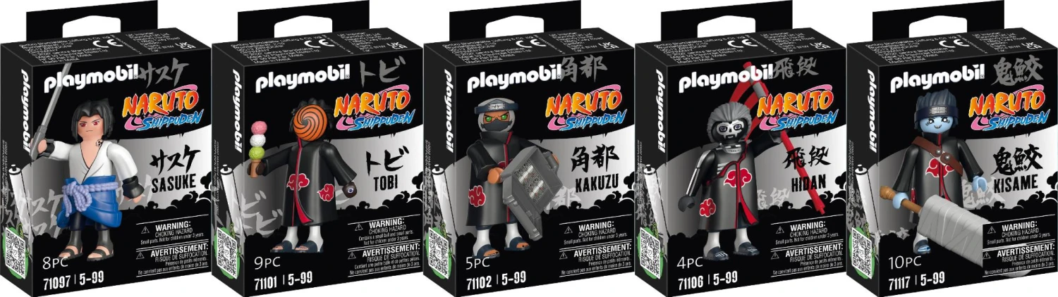 Playmobil 5er Set bestehend aus:PLAYMOBIL® Naruto 71097 SasukePLAYMOBIL® Naruto 71101 TobiPLAYMOBIL® Naruto 71102 KakuzuPLAYMOBIL® Naruto 71106 HidanPLAYMOBIL® Naruto 71117 KisamePLAYMOBIL® Naruto 71097 SasukeSasuke ist ein überlebendes Mitglied des Uchiha-Clans und Narutos alter Teamkollege, Freund und Rivale. Sasuke, der das Sharingan beherrscht, will sich an seinem Bruder Itachi rächen, weil er den gesamten Clan vernichtet hat. Um sicherzustellen, dass er die Macht hat, seinen Bruder zu besiegen, wendet sich Sasuke an den bösen Orochimaru. NARUTO SHIPPUDEN meets PLAYMOBIL. 24 neue Figuren für alle Anime-Begeisterten! Pünktlich zum 20-jährigen Jubiläum der Kultserie erscheint der sensationelle Anime-Erfolg jetzt im PLAYMOBIL-Format! Figuren: 1 Sasuke Tiere: – Zubehör: 1 Schwert PLAYMOBIL® Naruto 71101 TobiNARUTO SHIPPUDEN meets PLAYMOBIL. 24 neue Figuren für alle Anime-Begeisterten! Pünktlich zum 20-jährigen Jubiläum der Kultserie erscheint der sensationelle Anime-Erfolg jetzt im PLAYMOBIL-Format! Figuren: 1 Tobi Tiere: – Zubehör: 1 Dangobälle (Süße Reiskugeln) PLAYMOBIL® Naruto 71102 KakuzuNARUTO SHIPPUDEN meets PLAYMOBIL. 24 neue Figuren für alle Anime-Begeisterten! Pünktlich zum 20-jährigen Jubiläum der Kultserie erscheint der sensationelle Anime-Erfolg jetzt im PLAYMOBIL-Format! Figuren: 1 Kakuzu Tiere: – Zubehör: 1 Koffer PLAYMOBIL® Naruto 71106 HidanNARUTO SHIPPUDEN meets PLAYMOBIL. 24 neue Figuren für alle Anime-Begeisterten! Pünktlich zum 20-jährigen Jubiläum der Kultserie erscheint der sensationelle Anime-Erfolg jetzt im PLAYMOBIL-Format! Figuren: 1 Hidan Tiere: – Zubehör: 1 Sense, 1 Silikonschnur PLAYMOBIL® Naruto 71117 KisameKisame besitzt eine enorme Menge an Chakra, die es mit der von Naruto aufnehmen kann. Er ist ein Mitglied der Akatsuki und hat sich auf Jutsu im Wasserstil spezialisiert. Kisame äußert sich nur selten über die Akatsuki und seine wahren Motive sind unbekannt. NARUTO SHIPPUDEN meets PLAYMOBIL. 24 neue Figuren für alle Anime-Begeisterten! Pünktlich zum 20-jährigen Jubiläum der Kultserie erscheint der sensationelle Anime-Erfolg jetzt im PLAYMOBIL-Format! Figuren: 1 Kisame Tiere: – Zubehör: 1 Schwert Samehada, 1 Tragegurt
