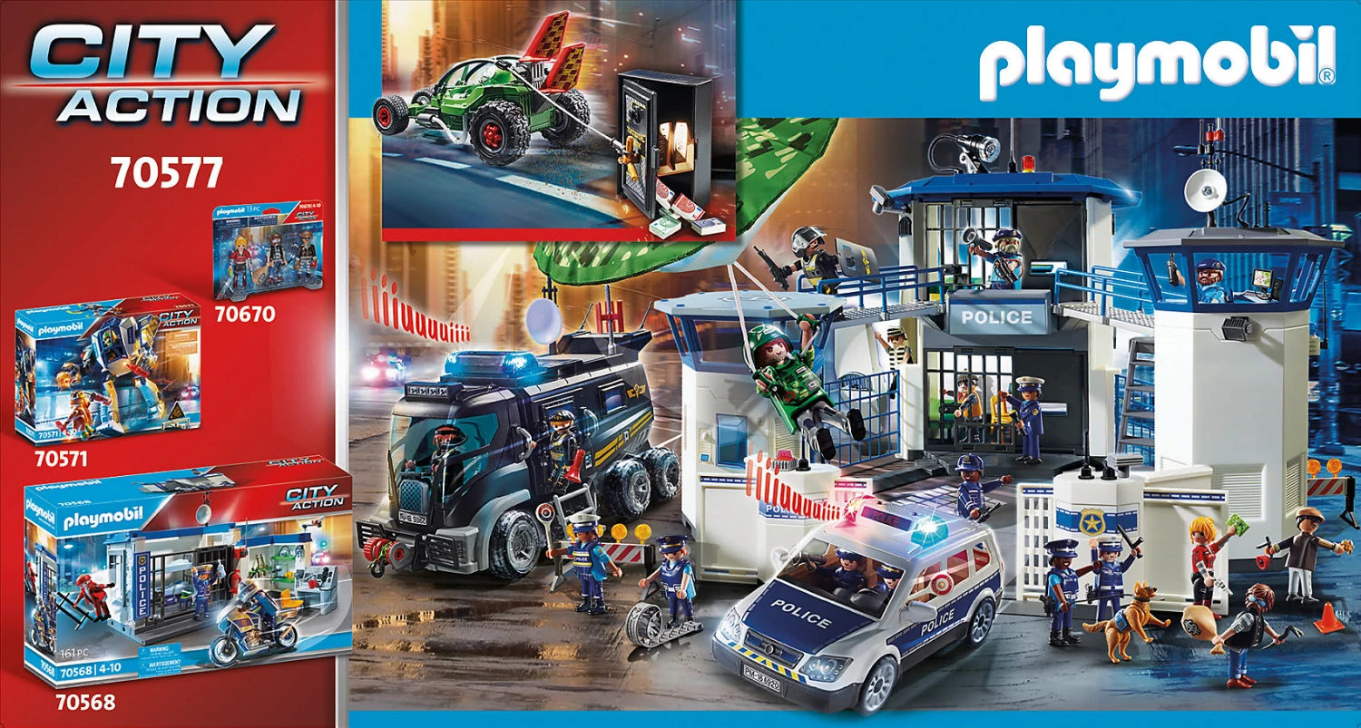 Zubehör: 1 Polizei-Kart, 1 Ganoven-Fahrzeug, 1 Tresor, 1 Nagelband, 1 Schlagstock, 1 Gewehr, 1 Taschenlampe, 1 Helm, 1 Goldbarren, 1 Seil, 6 Bündel Geldscheine, 2 Helme, 1 Paar Armmanschetten