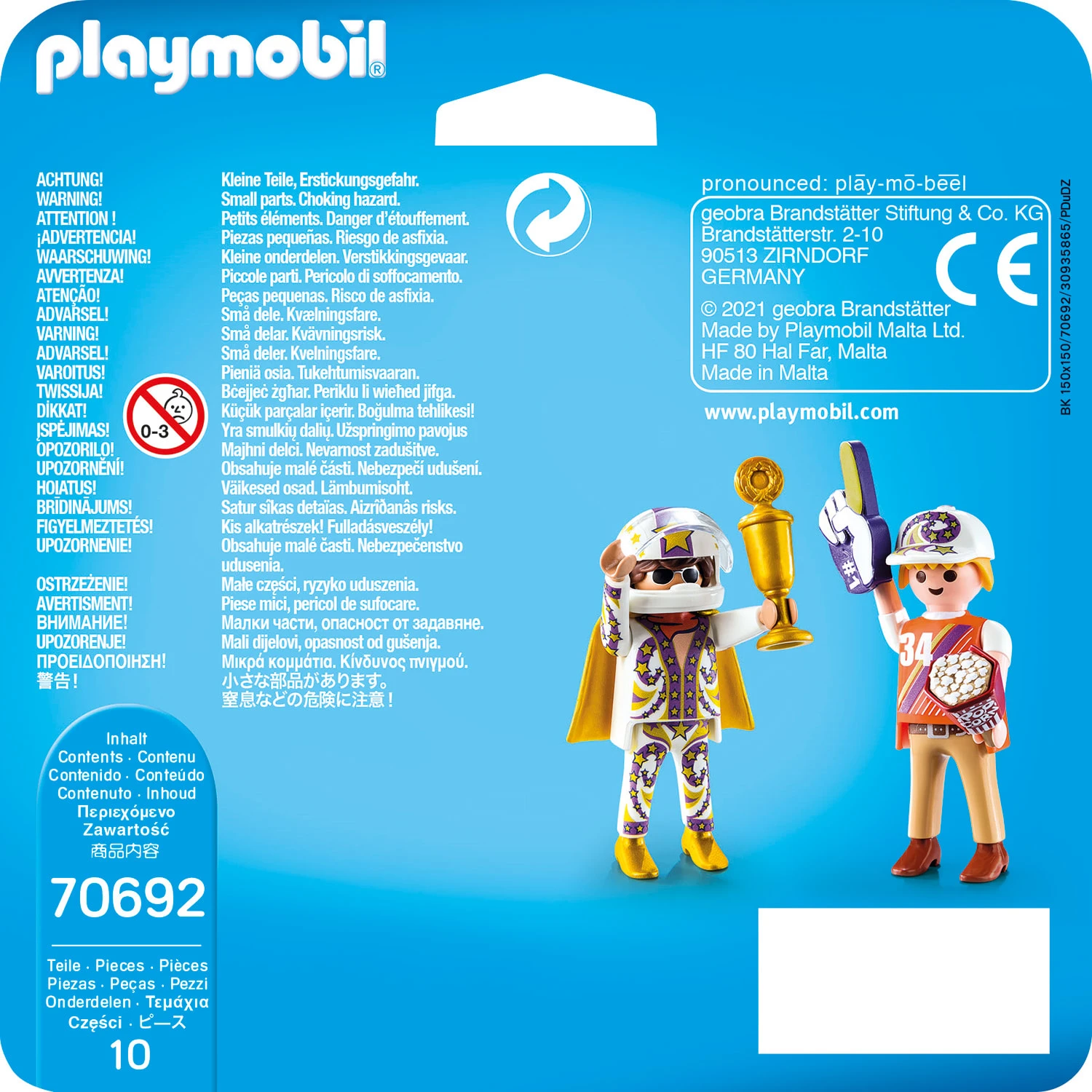 Für seinen Geschmack kann das Rennen nicht schnell genug, können die Stunts nicht spektakulär genug sein. Gerade hat er wieder einen Pokal gewonnen. Sein größter Fan jubelt ihm begeistert zu. PLAYMOBIL DuoPacks bieten doppelte Spielfreude. Zwei Figuren mit Accessoires sorgen für tolle kleine Spielabenteuer. Figuren: 2 Männer, Zubehör: 1 Umhang, 1 Helm, 1 Pokal, 1 Schaumstofffinger, 1 Schirmmütze, 1 Popcorn.