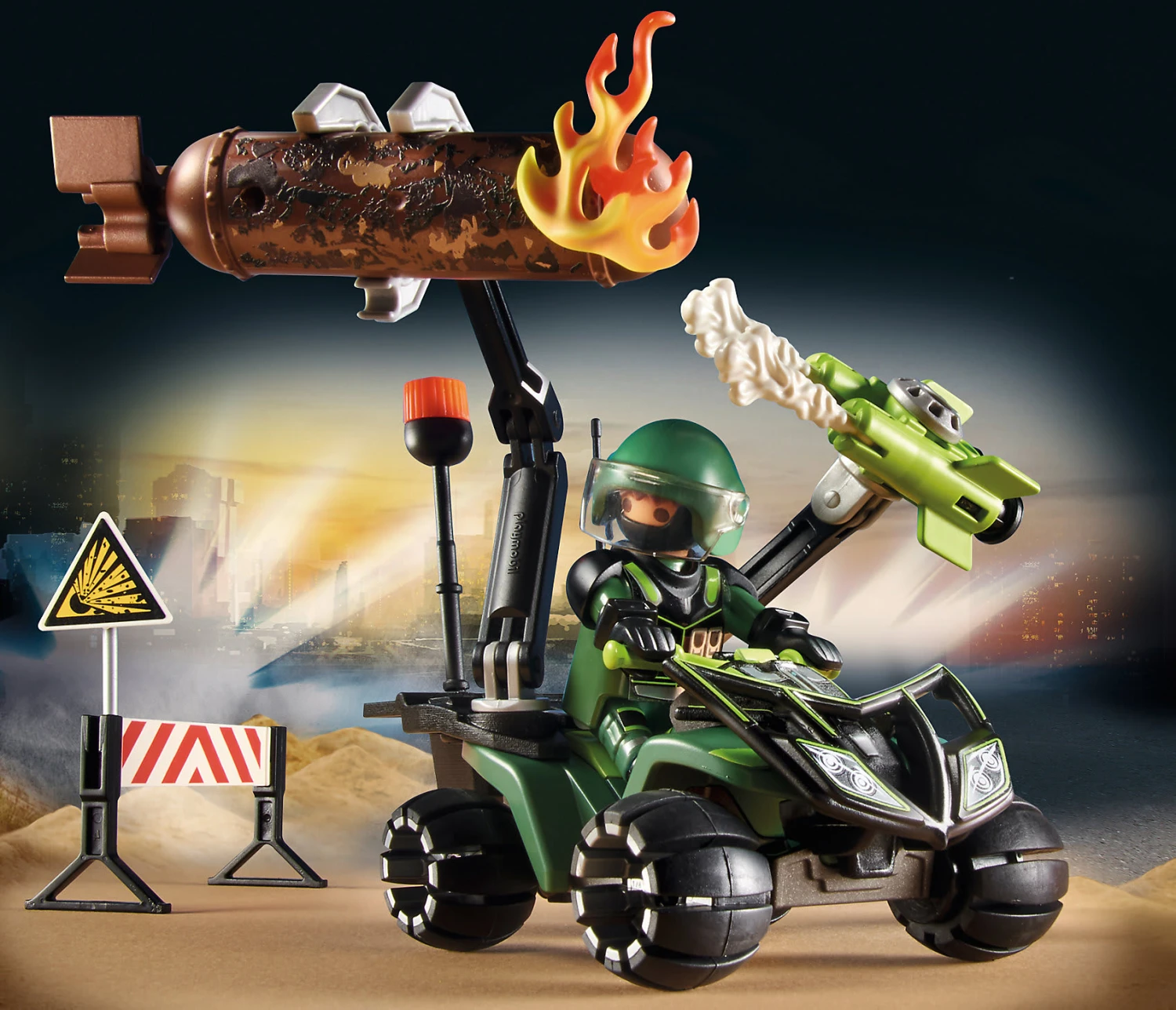 Es wurde eine alte rostige Bombe gefunden. Der Sprengmeister und die Polizei sind informiert. Mit dem Spieleset PLAYMOBIL® Starter Pack Polizei: Gefahrentraining (70817) können die Profis ausrücken, um die Gefahren zu beseitigen. Zunächst einmal sperrt der Polizist die Fundstelle weiträumig ab. Dann rückt der Sprengmeister auf seinem Quad an. Mit dem Greifarm hebt er die alte Bombe vorsichtig an, und bringt seinen Schaumlöscher in Position. Wird es dem Sprengmeister gelingen die Bombe zu entschärfen? Mit in dem Set enthalten sind zwei Spielefiguren, ein Einsatz-Quad und viel weiteres Zubehör für spannende Spielemomente.