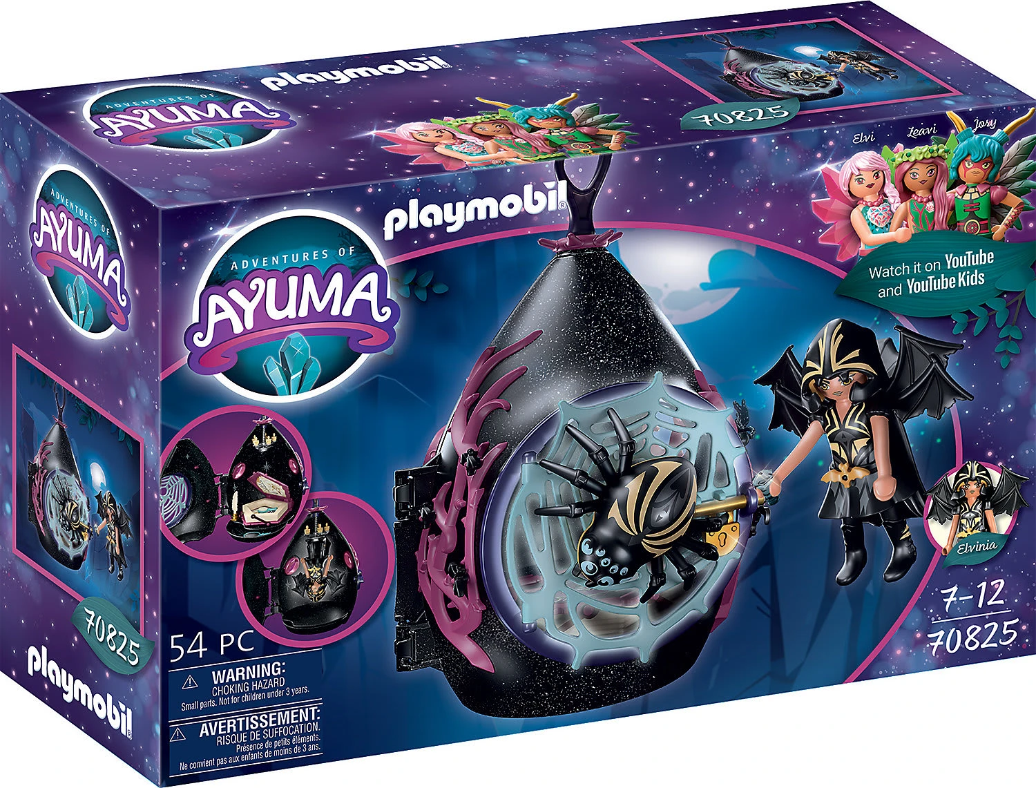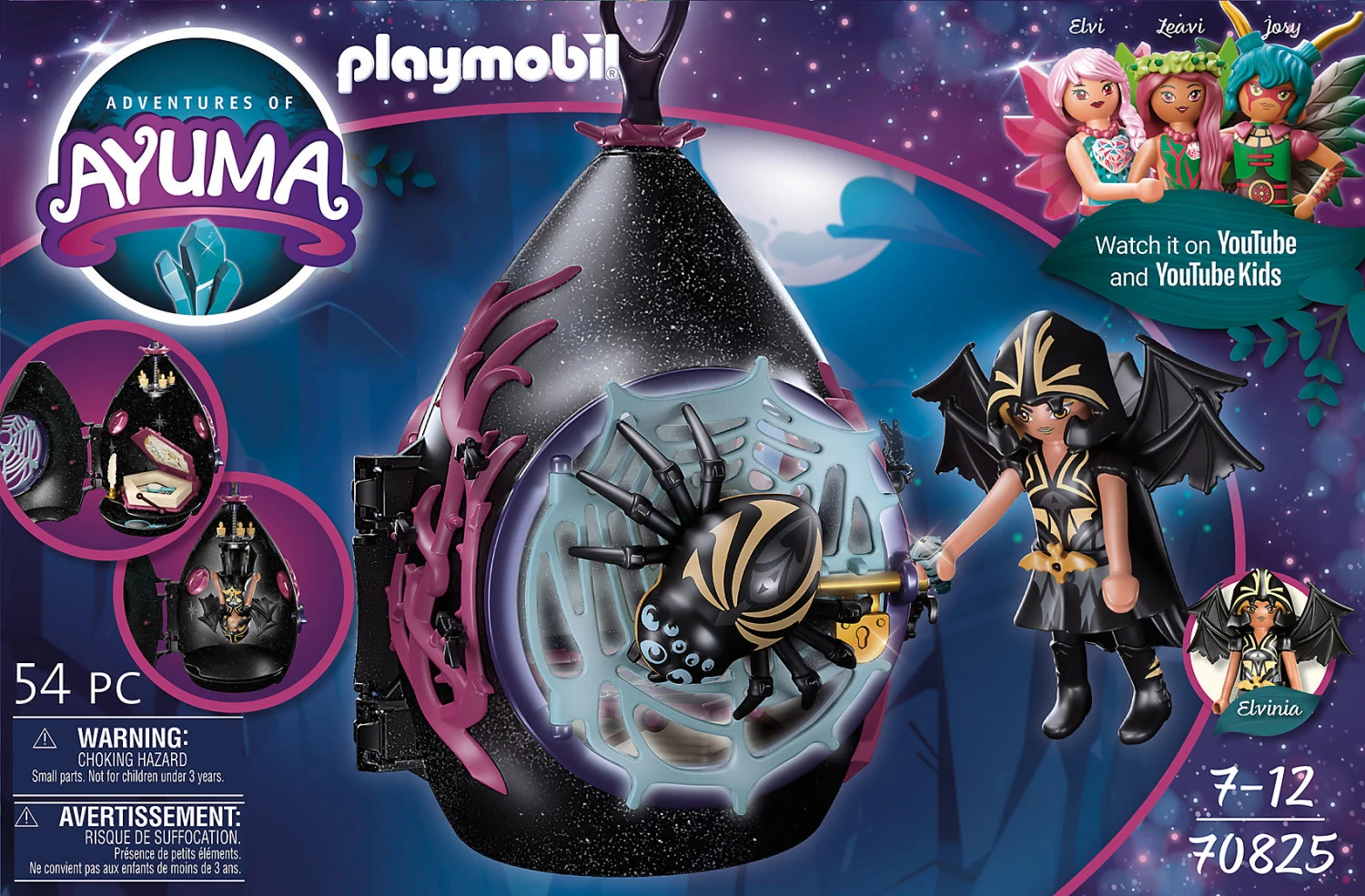Die kleinen Bat Fairies leben im Wald. Ihr Unterschlupf ist ein gemütlich-schauriges Tropfenhäuschen mit einem Kronleuchter. Mit dem Spieleset PLAYMOBIL® Unterschlupf der Bat Fairies (70825) gehen die Abenteuer rund um die Feen in Ayuma weiter. In ihrem Zuhause bewahrt die Bat Fairy die gestohlenen Kristalle in einem Geheimversteck im Buch auf. Sie studiert das magische Pergament, um herauszufinden wo andere Kristalle versteckt sein könnten, und schmiedet Pläne, um diese Kristalle in ihr Häuschen zu bringen. Das Tropfenhäuschen hängt verborgen im Wald und wird bewacht von ihrem treuen Seelentier – der Spinne. An der Spinnennetztür hält das große Tier Wache und die Bat Fairy fühlt sich sicher. Wenn es Schlafenzeit ist, hängt sie sich kopfüber an den Kronleuchter und träumt von funkelnden Kristallen. In dem Spieleset enthalten sind das Tropfenhäuschen mit einem Haken zum Aufhängen im Kinderzimmer, eine Bat Fairy mit Seelentier Spinne, drei kleine Kristalle, eine Feder, ein Tintenfass, eine Haarbürste und viele weitere Zubehörteile für kreative Spielemomente. Das Häuschen kann mit glitzernden Sternen-Stickern verziert werden und begeistert mit einem tollen Geheimfach.