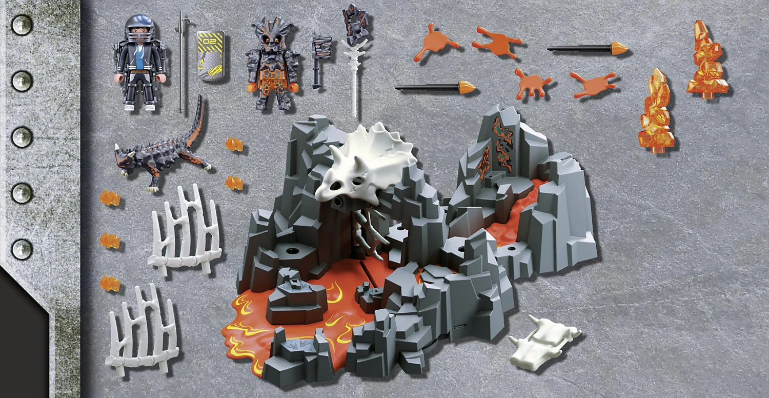 In dem spannenden Kampf um die wertvollen Energiesteine geht es für das Team Dino Rise in eine neue Runde. Mit dem Spieleset PLAYMOBIL® Wächter der Lavaquelle (70926) muss sich Ian vom Team Dino Rise neuen Herausforderungen und spannenden Abenteuern stellen. Um zu dem legendären Wächter der Lavaquelle zu gelangen, muss er so manche Hindernisse überwinden und sich in der unheimlichen Felsenkulisse voran arbeiten. Wird es Ian gelingen die Gefahren zu erkennen? Was ist das? Der Dinoschädel neigt sich nach hinten und ein Flammenprojektil fliegt durch die Luft! Was führt der Energiewächter im Schilde und wird Ian Hilfe von seinen Team Kolleg*innen bekommen? In dem Set enthalten sind die Spielefiguren Ian vom Team Dino Rise, ein Wächter und ein Dornteufel mit kompletten Ausrüstungen. Außerdem eine Lavaquelle mit mechanischen Fallen, ein Schutzschild und viele weitere Zubehörteile für spannende Geschichten und aufregende Abenteuer. Die auslegbare Silikonlava ermöglicht eine ganz individuelle Gestaltung der Quelle.