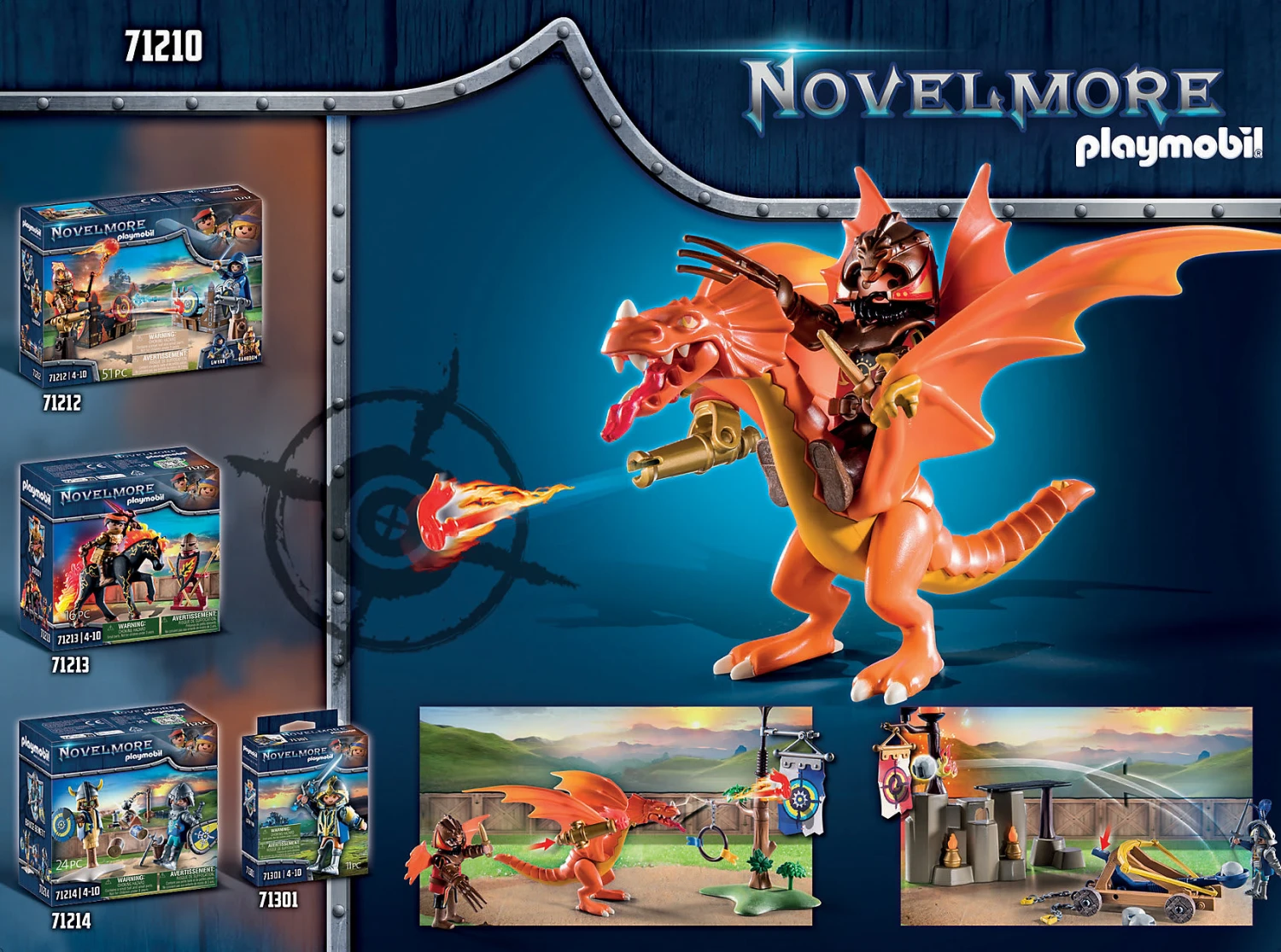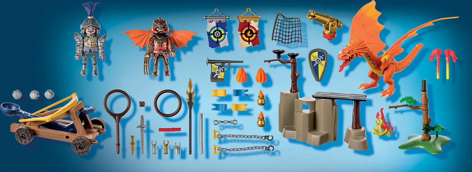 Für alle Novelmore-Abenteuer-Fans geht es jetzt auf dem Turnierplatz in eine neue Runde gegen die Burnham Raiders. Mit dem Spieleset PLAYMOBIL® Novelmore vs. Burnham Raiders – Turnierplatz (71210) kommen neue und große Abenteuer auf die Novelmore-Helden zu. Das Turnier wird gleich losgehen. Die Zielringe und die Fahnen sind aufgestellt und es treten der Novelmore-Ritter und der Burnham Raider auf den Platz. Beide sind gut ausgestattet: Das schussfähige Katapult wird in Position gezogen und mit der Kugel beladen. Wird es gelingen den Ziel-Ring zu treffen? Aber auch der Drache ist mit einem treffsicheren Schussgerät ausgestattet. Zum Nachspielen der coolen Abenteuer oder zum Erfinden eigener Geschichten kommen mit diesem Set viele Zubehörteile. In dem Spieleset sind 2 Spielefiguren, ein Drache und viele weitere Extras enthalten.
