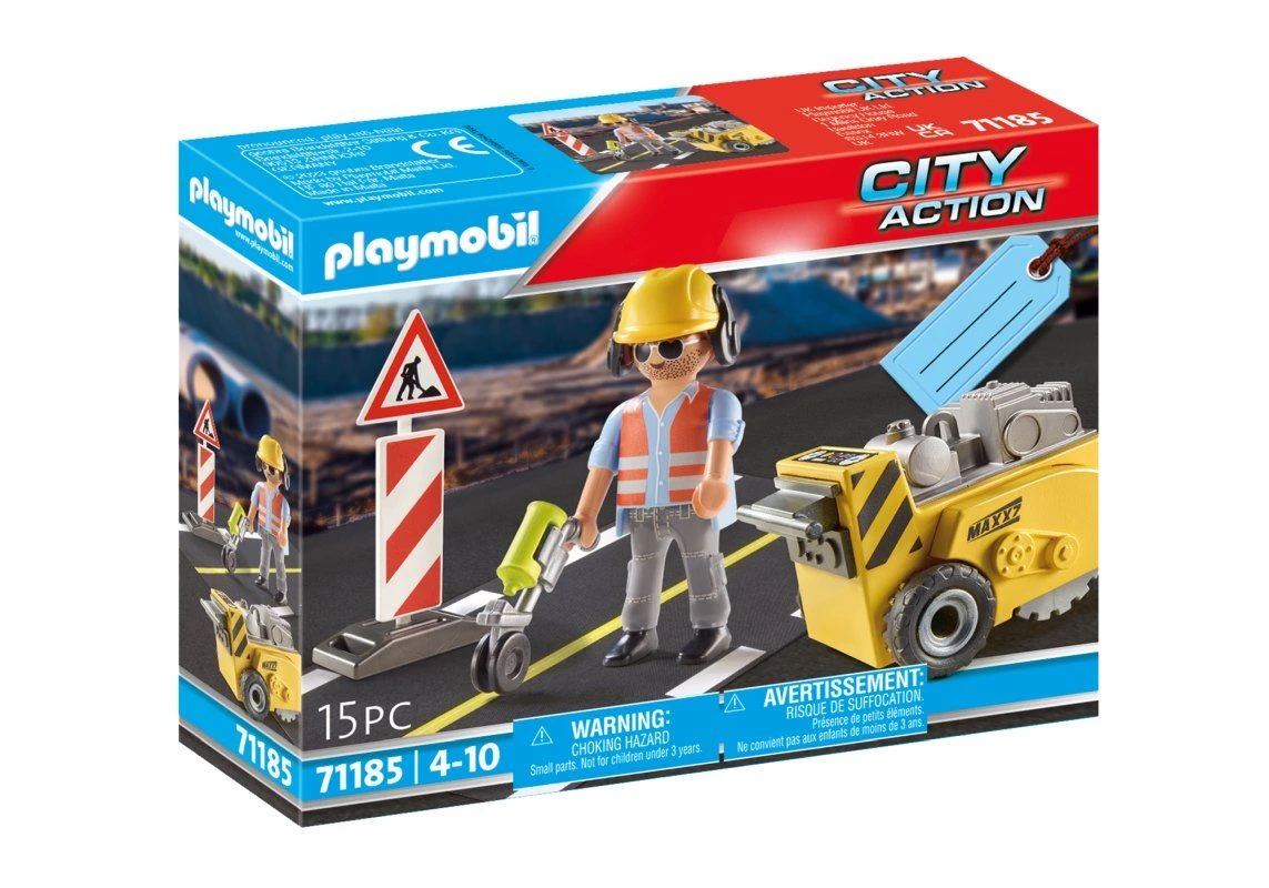 Figuren: 1 Bauarbeiter Zubehör: 1 Kantenfräser, 1 Spurmaler, 1 Baustellenschild, 2 Straßen
