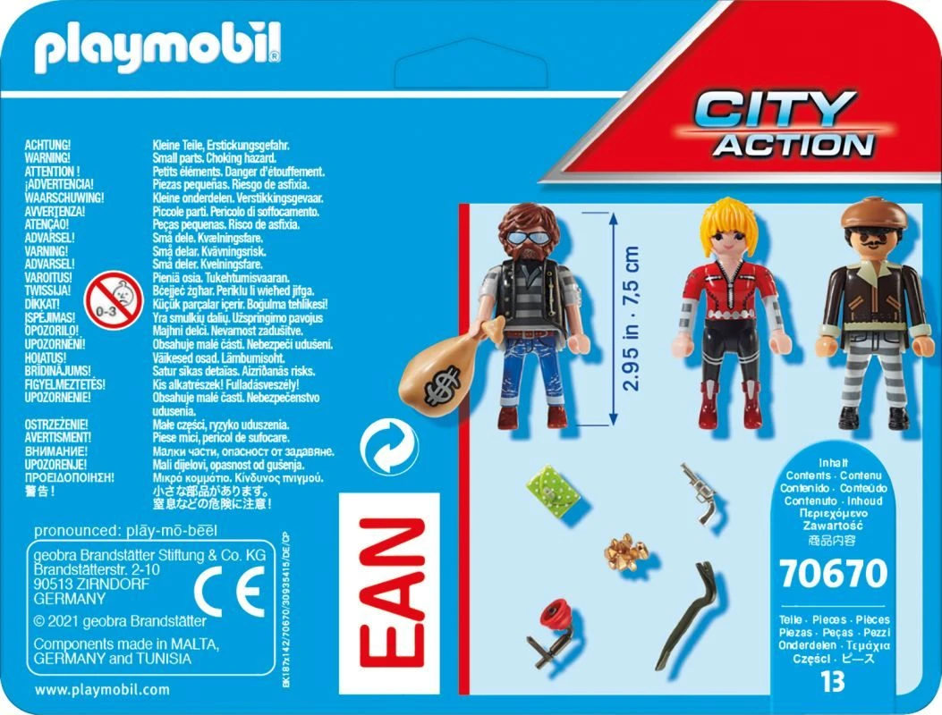 3 Ganoven-Figuren ausgestattet mit Diebesgut und Ganoven-Zubehör.