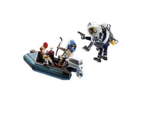 Der Polizist mit Düsenrucksack nähert sich dem mit einem Motor-Schlauchboot flüchtenden Kunsträuber. Maße Motor-Schlauchboot: 15 x 8 x 4,5 cm (LxTxH)