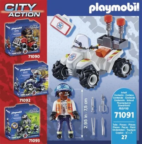 Das Set enthält eine PLAYMOBIL-Ärztin, ein Quad mit Rückzugsmotor, einen Arztkoffer mit Arztutensilien, Helm und Handschuhaufsätze.