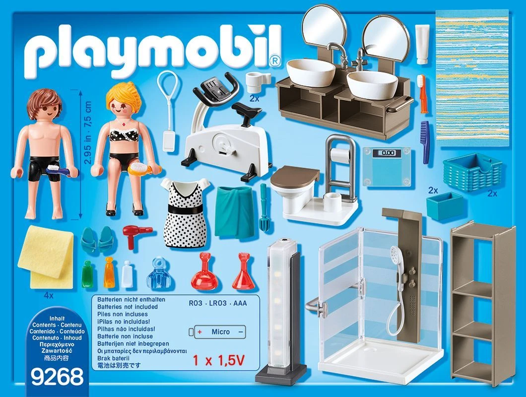 1 Mann, 1 Frau; Tiere: keine; Zubehör: 1 Dusche, 1 Doppelwaschtisch, 1 Lichtsäule, 1 Toilette, 1 Heimtrainer, 1 Regal, 1 Kleid, 1 Badetuch, 1 Waage, 4 Handtücher, 2 Kisten, 2 Körbe, 1 Paar Badeschlappen, 1 MP3-Player, 2 Flakons, 3 Kosmetikflaschen, 1 Tube, 2 Zahnbürsten, 1 Parfumflakon, 2 Becher, 1 Klobürste, 1 Teppich, 1 Haarbürste, 1 Kamm, 1 Fön