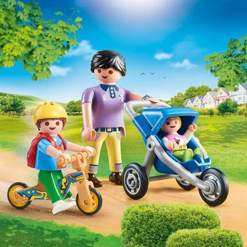 Die Mutter bringt Ihre Kinder mit dem Sportbuggy und Laufrad sicher zur KiTa und zur Krabbelgruppe.