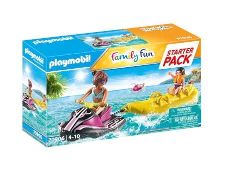 Auf zu wilden Wasserfahrten mit dem PLAYMOBIL-Wasserscooter. Begeistert sitzt das kleine Mädchen auf dem Bananenboot und wird von der Frau auf dem Wasserscooter durch die Wellen gezogen. Dank ihrer Schwimmweste ist das Mädchen gut geschützt, sollte es doch mal selbst im Wasser landen. PLAYMOBIL Starter Packs eigenen sich ideal als Einstieg oder Ergänzung der vielen bunten PLAYMOBIL-Spielwelten. Das Spielset enthält eine Frau und ein Mädchen, einen Wasserscooter, ein Bananenboot und eine Rettungsweste. Der Wasserscooter kann mit einem Unterwassermotor ausgestattet werden.