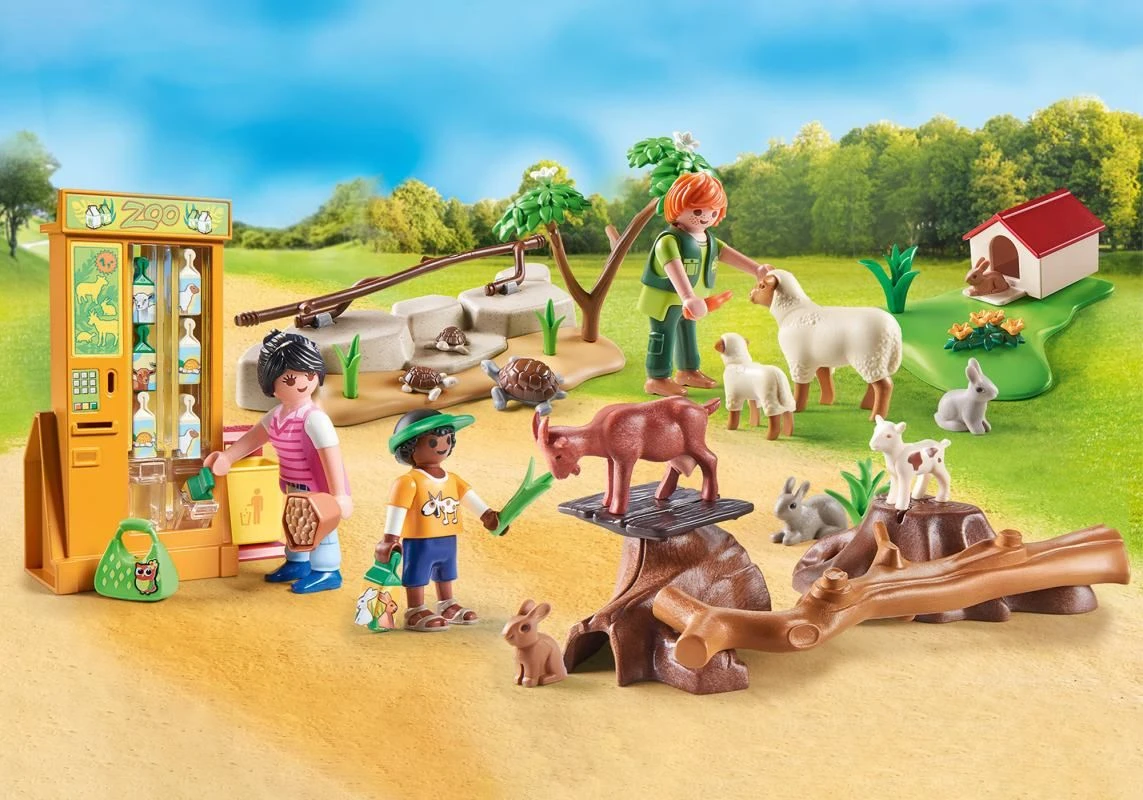 Ein liebevoll gestaltetes Spielset für tierliebe Kinder. Das Set enthält drei PLAYMOBIL-Figuren, eine Ziege mit Zicklein, ein Schaf mit Lamm, zwei Kaninchen mit Babys, eine Schildkröte, einen Futterautomaten, acht Futtertüten und viele weitere tolle Extras. Der Futterautomat ist funktionsfähig und kann immer wieder mit Tierfutter aufgefüllt werden. Das Spielset eignet sich ideal zur Erweiterung des großen Erlebnis-Zoos 71190.