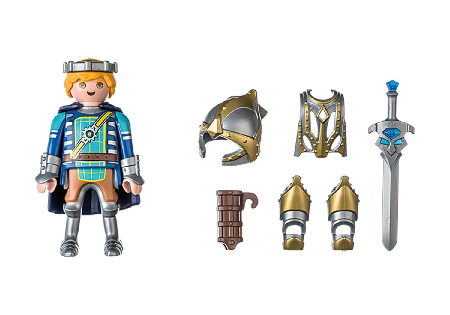 Figuren: 1 Ritter Zubehör: 1 Krone, 1 Umhang, 1 Köcher, 2 Armrüstungen, 1 Brustpanzer, 1 Helm, 2 Armmanschetten. Prinz Arwynn ist immer bereit für das nächste Abenteuer. Egal ob es gegen die feurigen Burnham Raiders oder in die Wüste von Sal’ahari Sands geht, Arwynn stellt sich jeder Herausforderung mit Mut und Entschlossenheit und mit seinen Freunden Gwynn und Dario. Neben Schwert und Umhang steht Arwynn die magische Rüstung Invincibus zur Verfügung. Legt er diese an, wird er unbesiegbar und schlägt jeden Feind mit Leichtigkeit in die Flucht. Ein perfektes Mitbringsel oder Geschenk für Ritterfans ab 4 Jahren. Produktdetails: Das 11-teilige Ritter-Spielzeug enthält Novelmore Charakter Prinz Arwynn mit Krone, Umhang, Köcher, Helm, Brustpanzer und weiteren Extras für aufregende Ritterabenteuer. Armmanschetten, Umhang und Waffenhalter können abgenommen und gegen Helm und Harnisch der Invincibus Rüstung ausgetauscht werden. Ebenfalls im Set enthalten sind tolle Sticker und eine Arwynn Sammelkarte. Noch mehr Ritterspielspaß gibt es in Kombination mit den weiteren Sets der fantastischen Novelmore-Spielwelt.