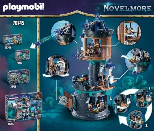 Das Spielset enthält die Novelmore-Zauberer Sagithor und Jutsithor und Zauberin Crysthella, einen Zaubererturm mit Drehmechanismus und Geheimversteck sowie schussfähiger Kanone, Zauberkessel, Zauberbuch, Kristalle und viele weitere fantastische Extras für magische Spielstunden.