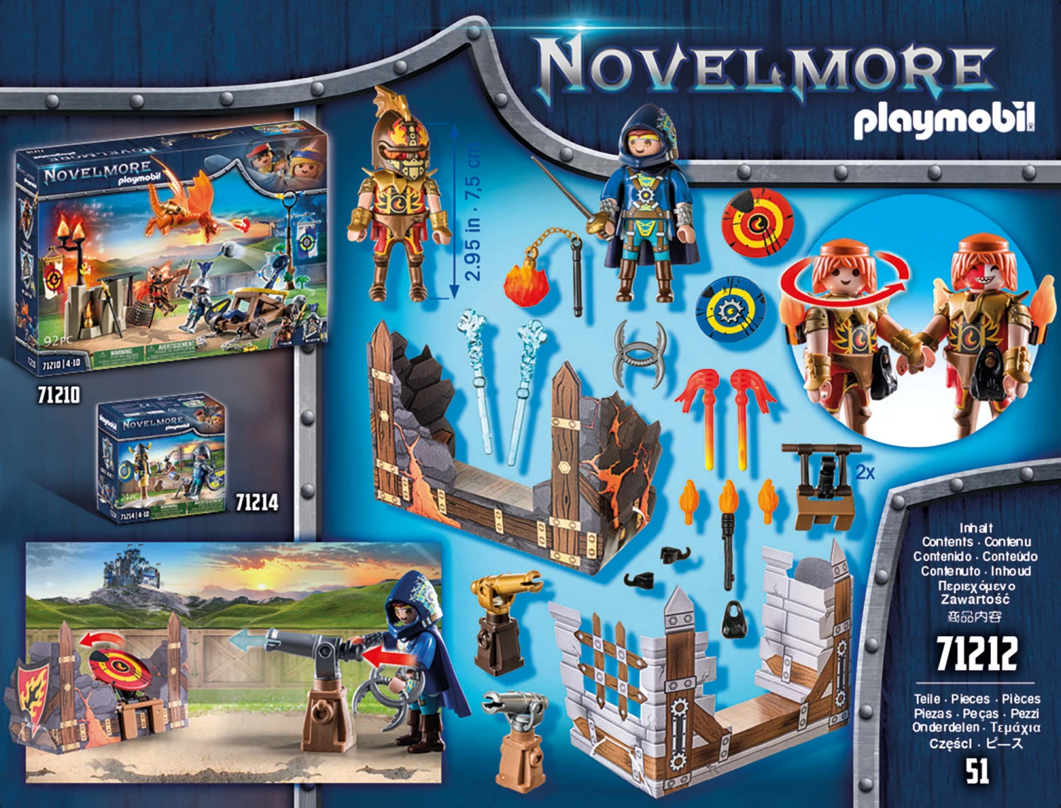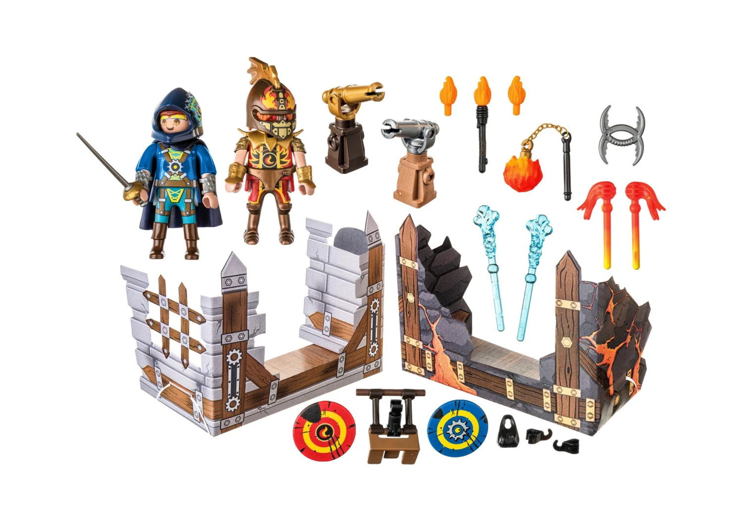 Figuren: 1 Ritterin, 1 Figur. Zubehör: 2 Papp-Mauern, 2 Kanonen mit Sockel, 2 Feuergeschosse, 2 Wassergeschosse, 2 Schilde, 2 Halterungen für Schild, 1 Haube, 1 Umhang, 1 Degen, 2 Armmanschetten, 1 Doppel-Klinge, 1 Tasche, 1 Helm, 3 Flammen, 1 Flammenstab, 2 Flammen-Adapter, 2 Armmanschetten, 1 Morgenstern mit Feuerball. Auf zum spannenden Ritterduell! Kämpferin Gwynn stellt sich mit der Wasserstrahl-Kanone, Kaboom mit seinem Feuergeschoss entgegen. Jede Partei versucht die Zielscheibe des Gegners zu treffen und umzukippen. Gwynn ist eine gute Schützin, doch auch Kaboom hat Zielwasser getrunken und die beiden liefern sich einen intensiven Wettstreit. Die detailreichen Novelmore-Spielsets laden mit interessanten Charakteren und raffinierten Funktionen zu aufregenden Ritterabenteuern im Kinderzimmer ein. Großer Spielspaß für Mädchen und Jungen ab 4 Jahren. Produktdetails: Das ultimative Ritterduell: Die beiden Zielscheiben werden in die Mauerbefestigungen aus Karton eingelegt. Bei Berührung kippt die Zielscheibe 90 Grad nach hinten und die Ritter können Punkte sammeln. Bewegliche Kanonen: Beide Kanonen sind dreh- und schwenkbar und über eine Aufhängung mit dem Sockel verbunden. Die Kanonen werden von vorne beladen und die Geschosse durch Betätigen des Auslösers herauskatapultiert. Flexibel ausgerüstet: den Figuren können Armmanschetten, Kopfbedeckungen, Umhang und Flammen abgenommen werden. Die Mimik machts: Kaboom hat ein Wechselgesicht, das durch Abnehmen der Frisur gewechselt werden kann. Sicherheit geht vor: alle PLAYMOBIL Spielsets entsprechen höchsten Qualitäts- und Sicherheitsstandards.