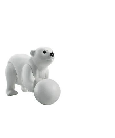 Das PLAYMOBIL-Set enthält einen jungen Eisbären, einen Schneeball und eine Tierwissenskarte. Das Eisbärjunge kann seinen Kopf nach oben und unten neigen und die vier Beine einzeln bewegen.